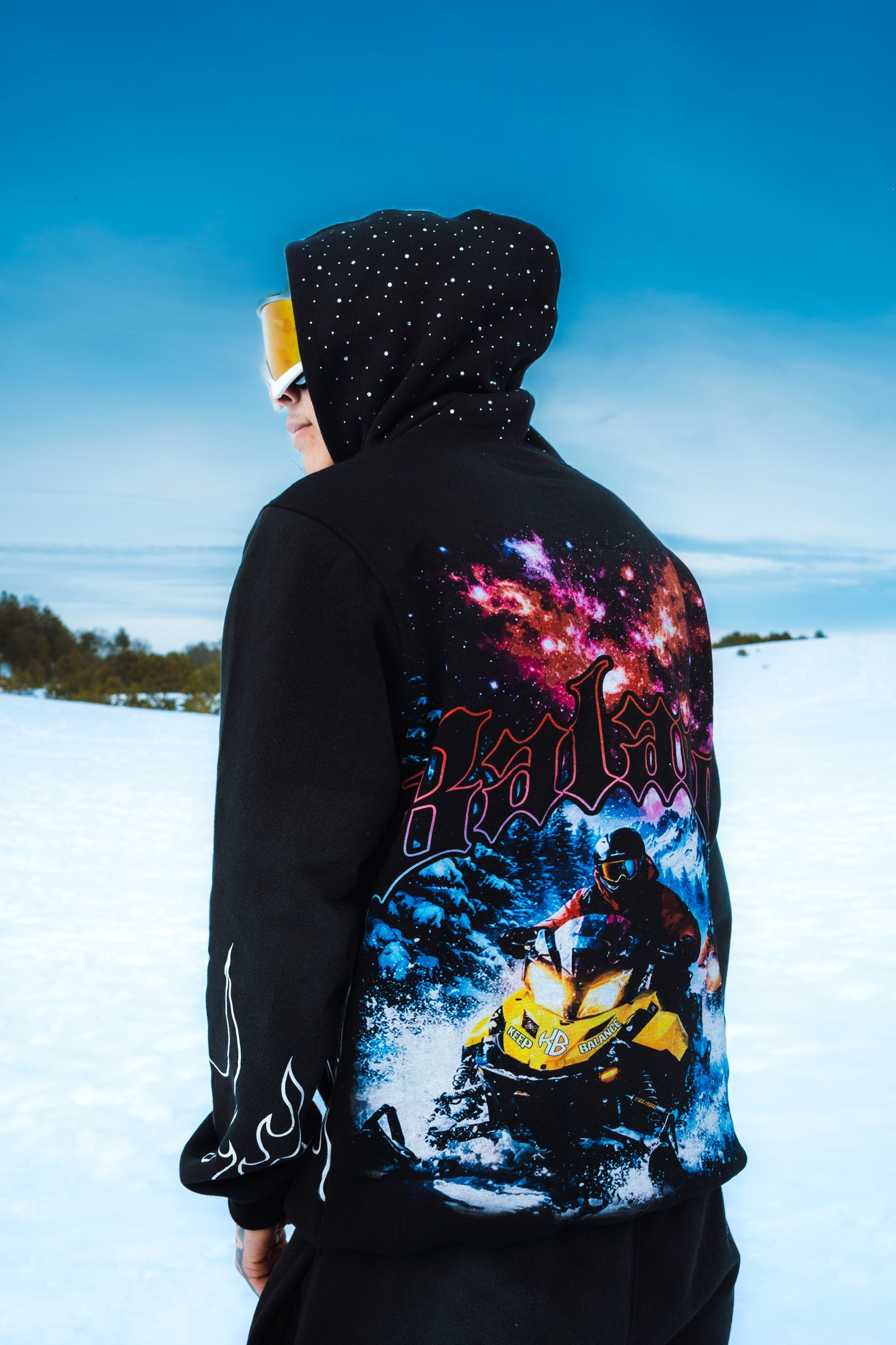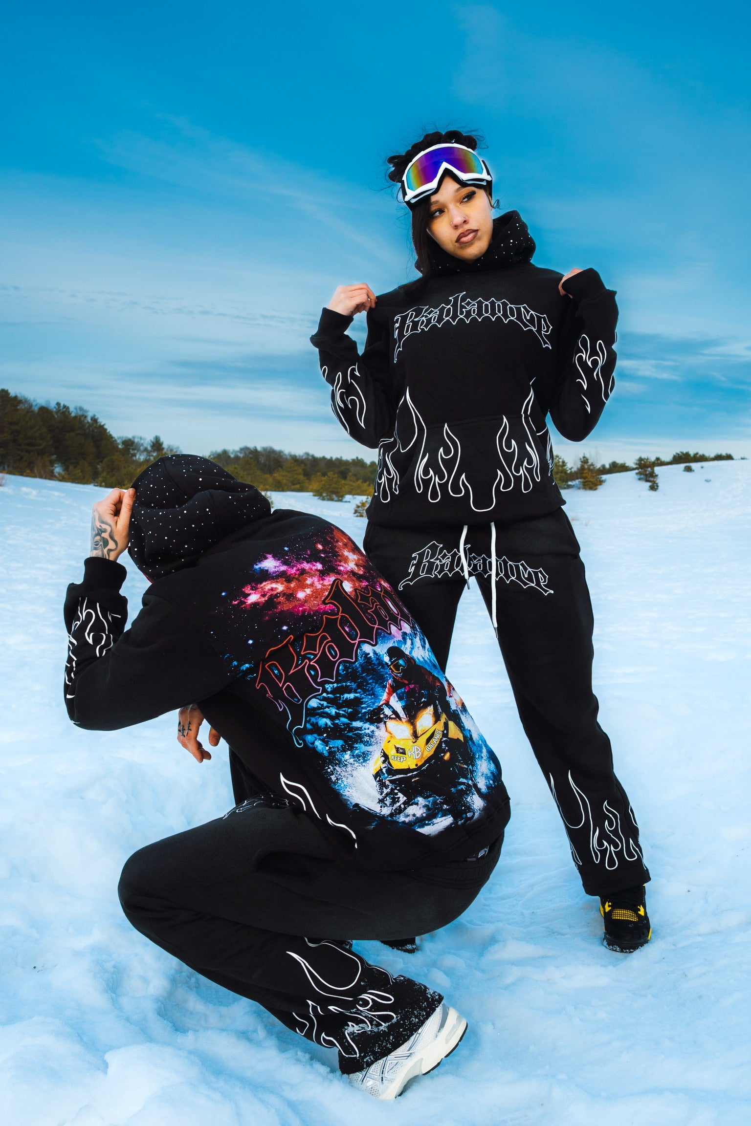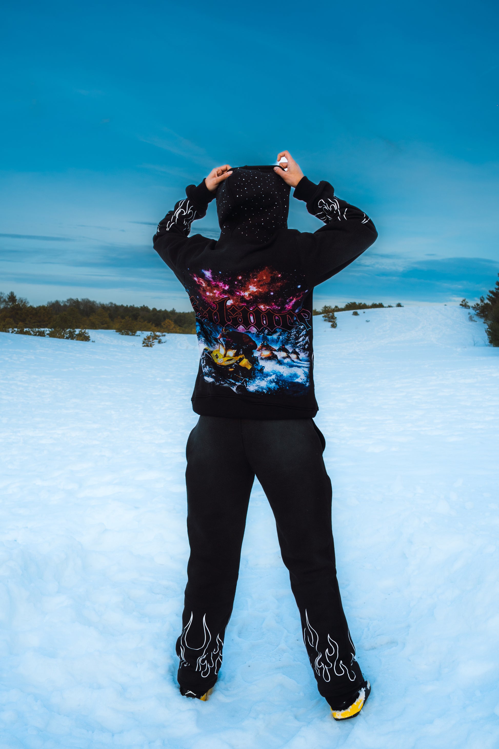 The CrossSpace Set blends bold design with everyday comfort. Featuring a striking sun fade and black colorway, this two-piece is crafted from 100% premium cotton for a soft feel and structured fit. The hoodie is finished with rhinestone detailing that reflects light with movement, adding a luxury streetwear edge.